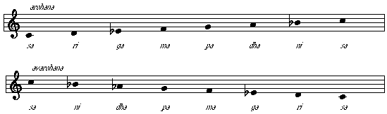 | Note that catus śruti dhaivat appears in ascent, while śuddha dhaivat occurs in descent. |